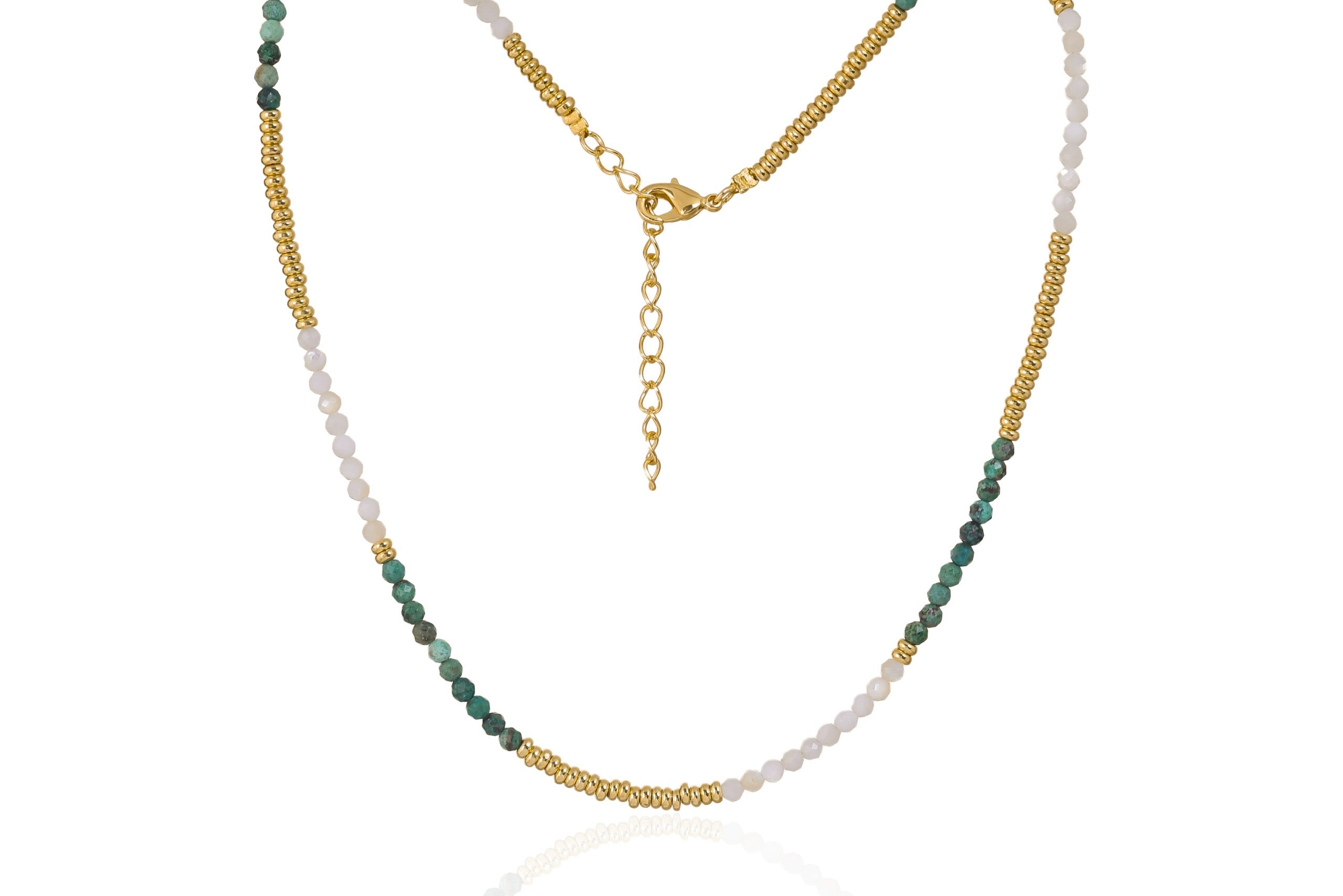 Fresh, coastal and effortlessly wearable. The Divine Pearl & Turquoise Necklace pairs petite turquoise beads with soft white accents and gold-toned detail, creating a light, summery piece you can layer or style solo. Its relaxed elegance makes it perfect for everyday outfits, beach-side days or adding a gentle pop of colour to your stack.