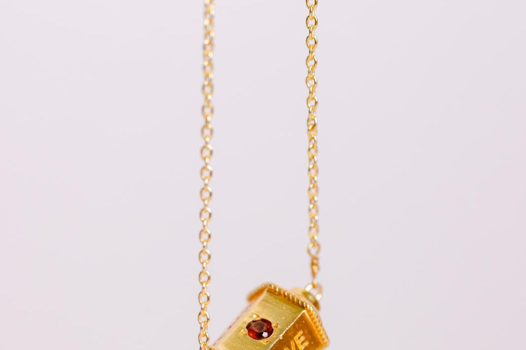 The Love Hope Faith Barrel Necklace is a heartfelt talisman for everyday wear. Crafted in radiant gold plating, this intricate barrel pendant features delicate rope detailing, an engraved “LOVE” inscription, and a single hand-set Garnet gemstone to symbolise passion and inner strength. A timeless reminder of what truly matters most, it sits beautifully on a fine gold chain — perfect for layering or wearing close to the heart.